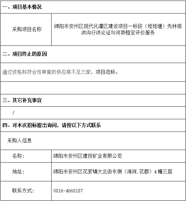 綿陽市安州區(qū)現(xiàn)代化灌區(qū)建設(shè)項目一標段(娃娃堰)先林排洪溝行洪論證與河勢穩(wěn)定評價服務(wù)流標公告